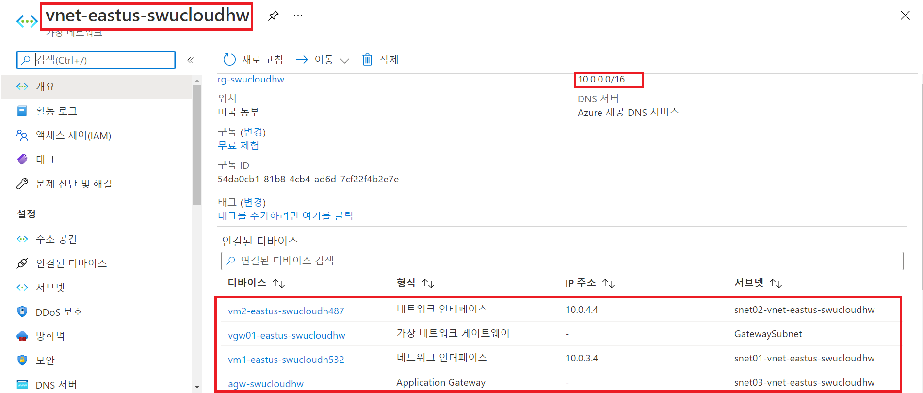 미국 동부에 위치한 vnet-eastus-swucloudhw 의 주소 공간은 10.0.0.0/16 이며 이 가상네트워크에 속한 디바이스들을 확인할 수 있다.