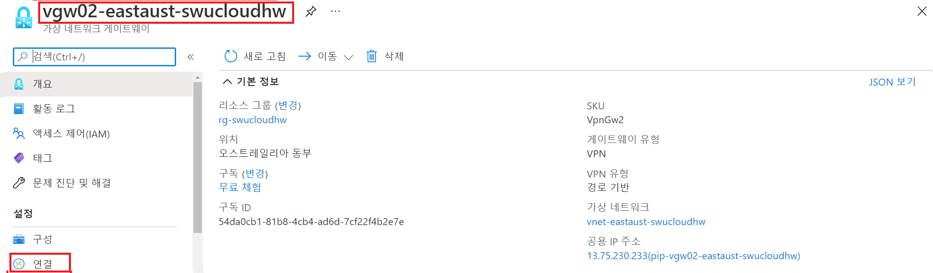 가상 네트워크 : vnet-eastaust-swucloudhw