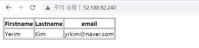 response2 테이블과 연결되어 있는 두 번째 가상머신의 공인 IP 52.149.217.157 로 접속하면 우리가 입력했던 레코드가 보인다. (lastname = Kim)